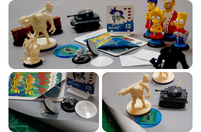 Bases - Bases are designed to allow you to conveniently use your existing miniatures. For most standard-sized miniatures, our base will easily snap onto the bottom. Bases come in two varieties: RFID and RFID Precision. RFID allows you coarsely track and uniquely identify game pieces across the RFID Tracking Grid. Precision Bases have a custom circuit board that allows for both RFID tracking as well as two-way communication. The two-way communication can be used for such things as increasing the precision of the position tracking or to control small motors and other miniature electronics. For example, you could have a dragon miniature with a Precision Base that has a tiny smoke generator and some red LEDs attached to it. The software could then tell the base to turn on the smoke generator and the red LEDs, providing an illusion that the dragon is breathing fire.